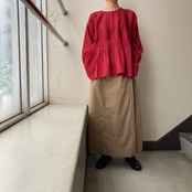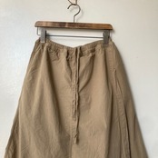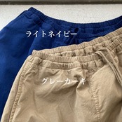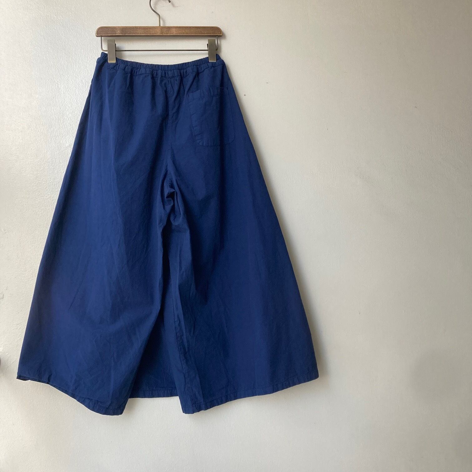 製品染めを施すことで現れる程よい生地のシワ感、光の当たり方で表情が変わる奥行きのある色味が魅力のシリーズです。腰にエプロンを巻いたようなデザインで、正面からはスカート風に、バックスタイルはパンツに見える特徴的なデザイン。ウエストはゴムと紐で調整可能なイージー仕様でゆったりとした履き心地が◎。普段スカートを履かれない方にもおすすめなアイテムです。