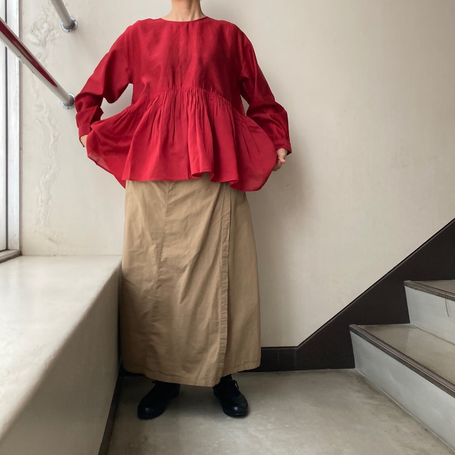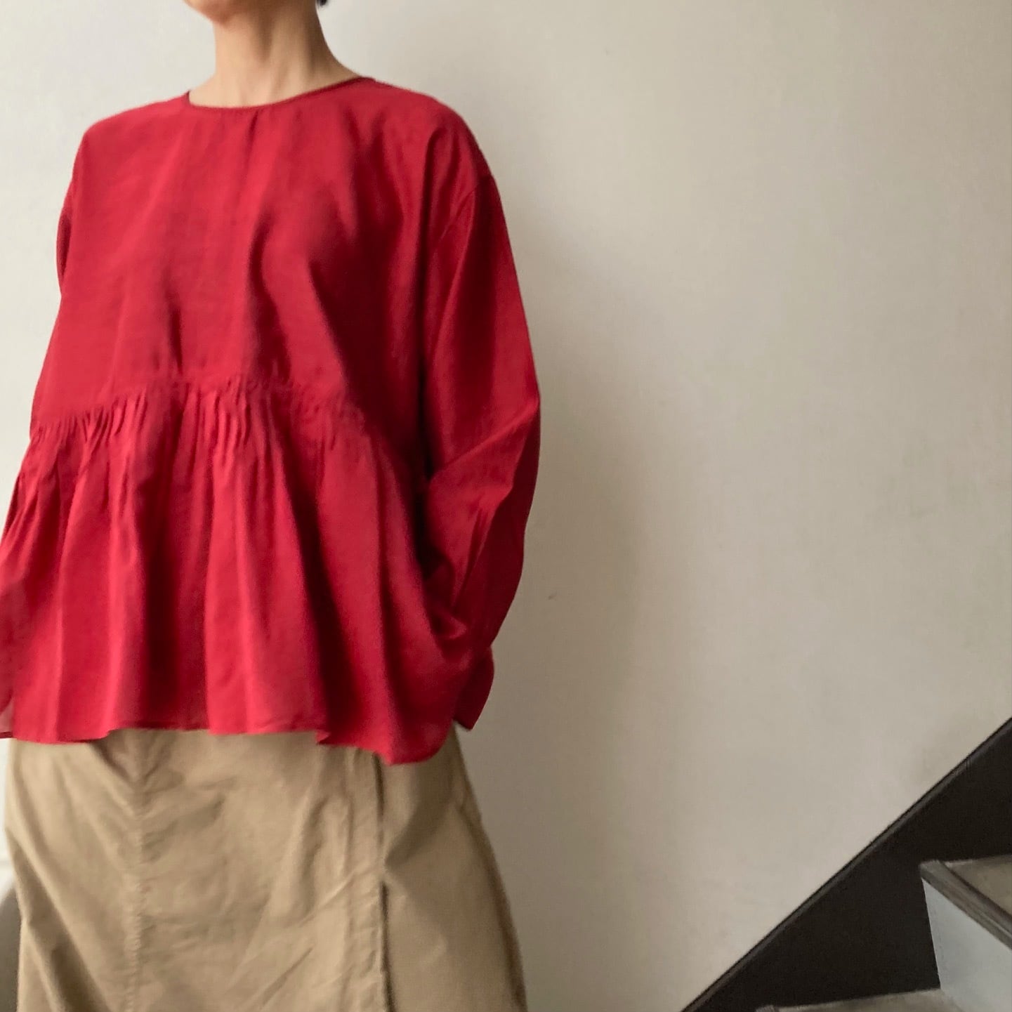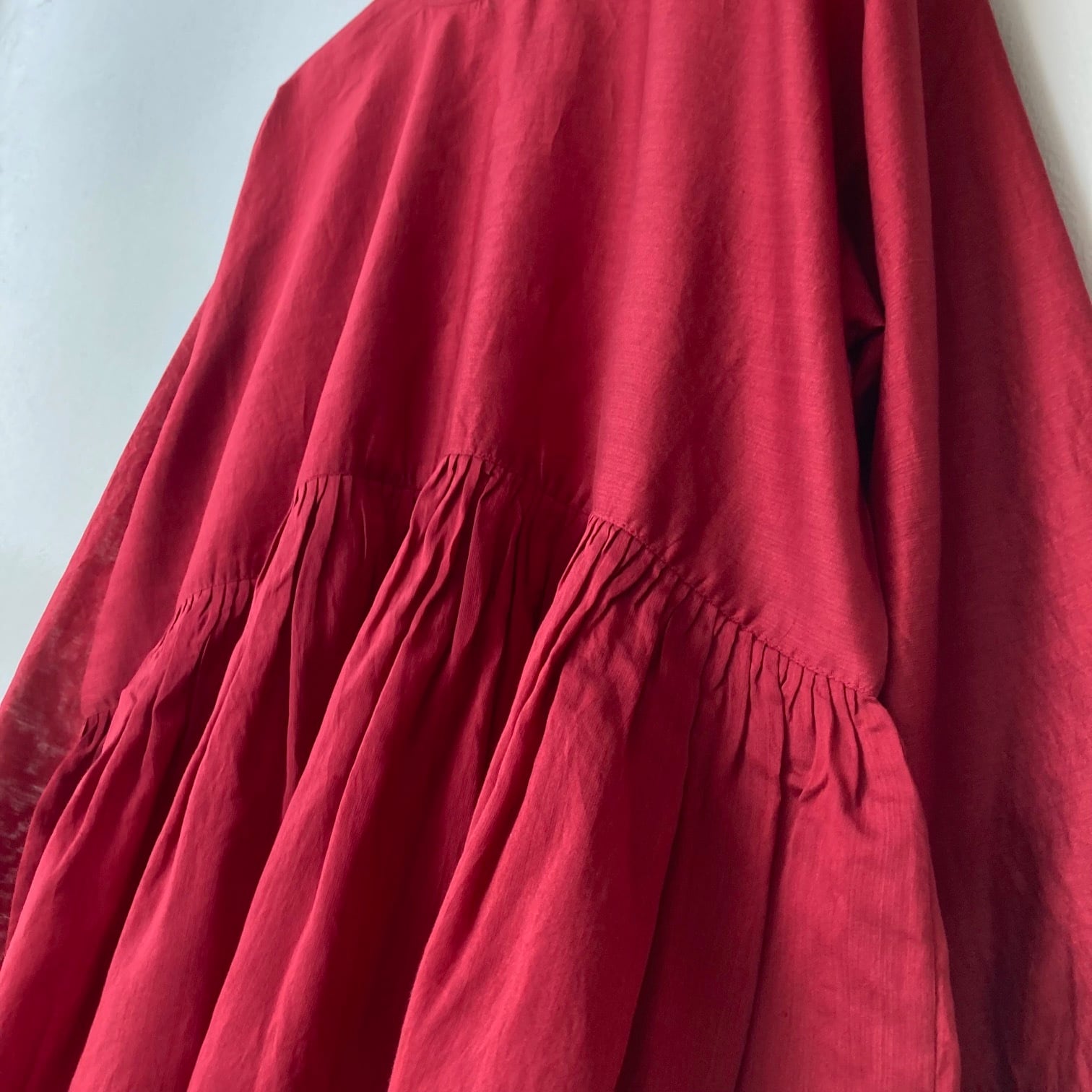コットンシルク素材による柔らかな着心地と艶感のある素材で、上質な生地感を感じられるシリーズです。ギャザーはインド北西部ラジャスタン地方の伝統技法で、細かいギャザーとタックを組み合わせた"ラジャスタンタックギャザー"を採用。インドの職人の手により丁寧に施されたラジャスタンタックギャザーは、すっきりと整った見た目が特徴で、高い技術とこだわりが詰まったディテールです。深い落ち着きのある赤は大人の雰囲気です。