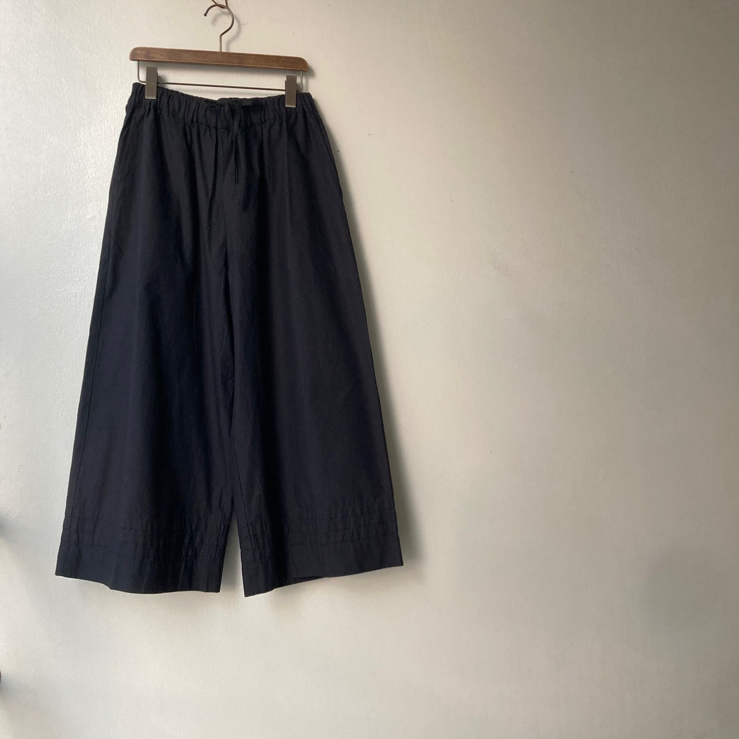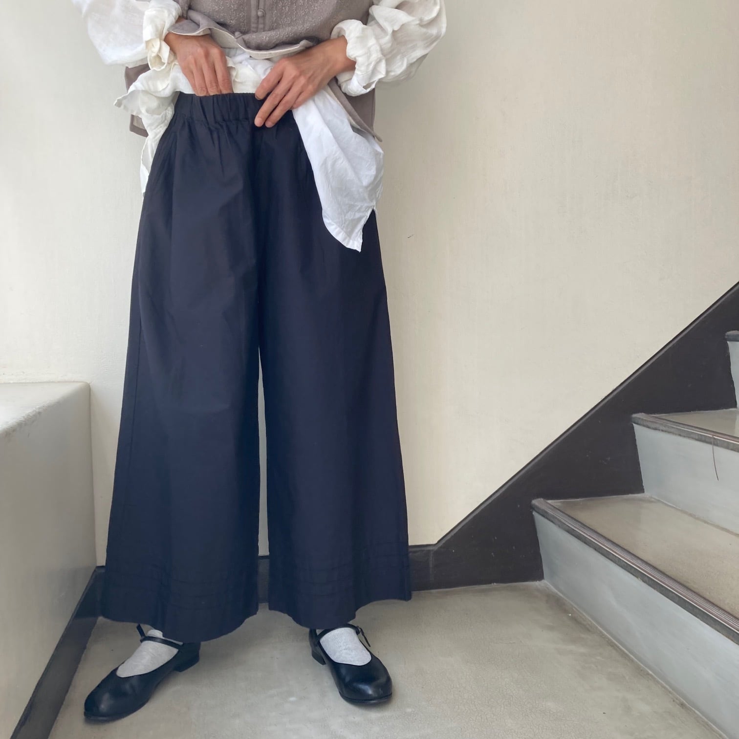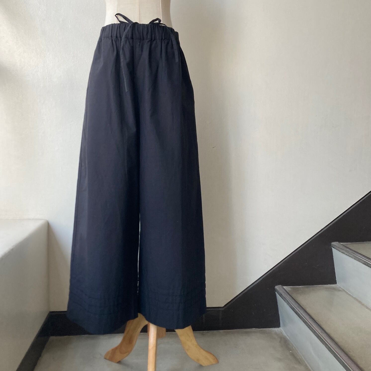 40番手の中細糸で織り上げた、程よいハリ感と光沢のある生地感が特徴のポプリン素材を使用。緻密に織り上げられた100%コットン生地は、透け感がなくしっかりとした仕上がりが魅力です。ライトな着心地にウエストゴム+紐で調整可能なイージー仕様。