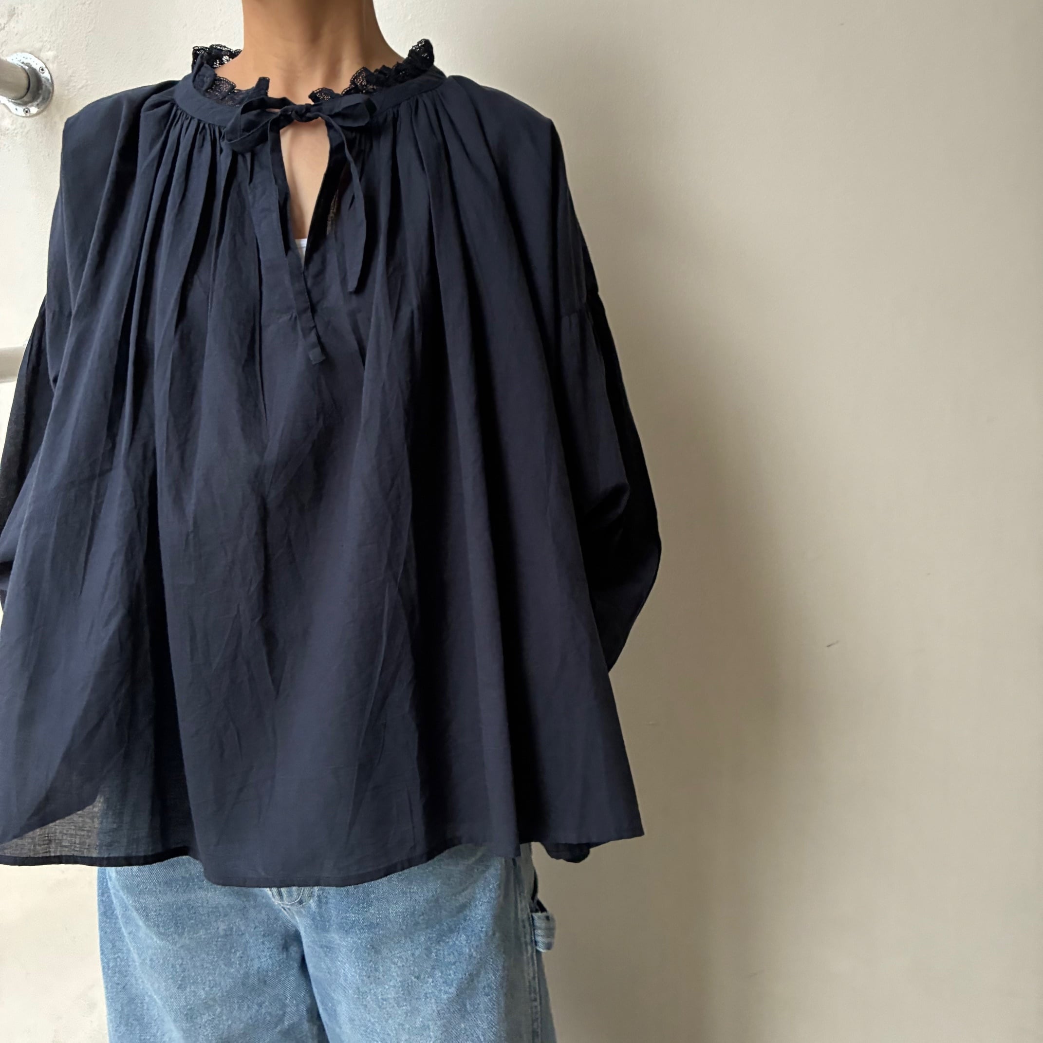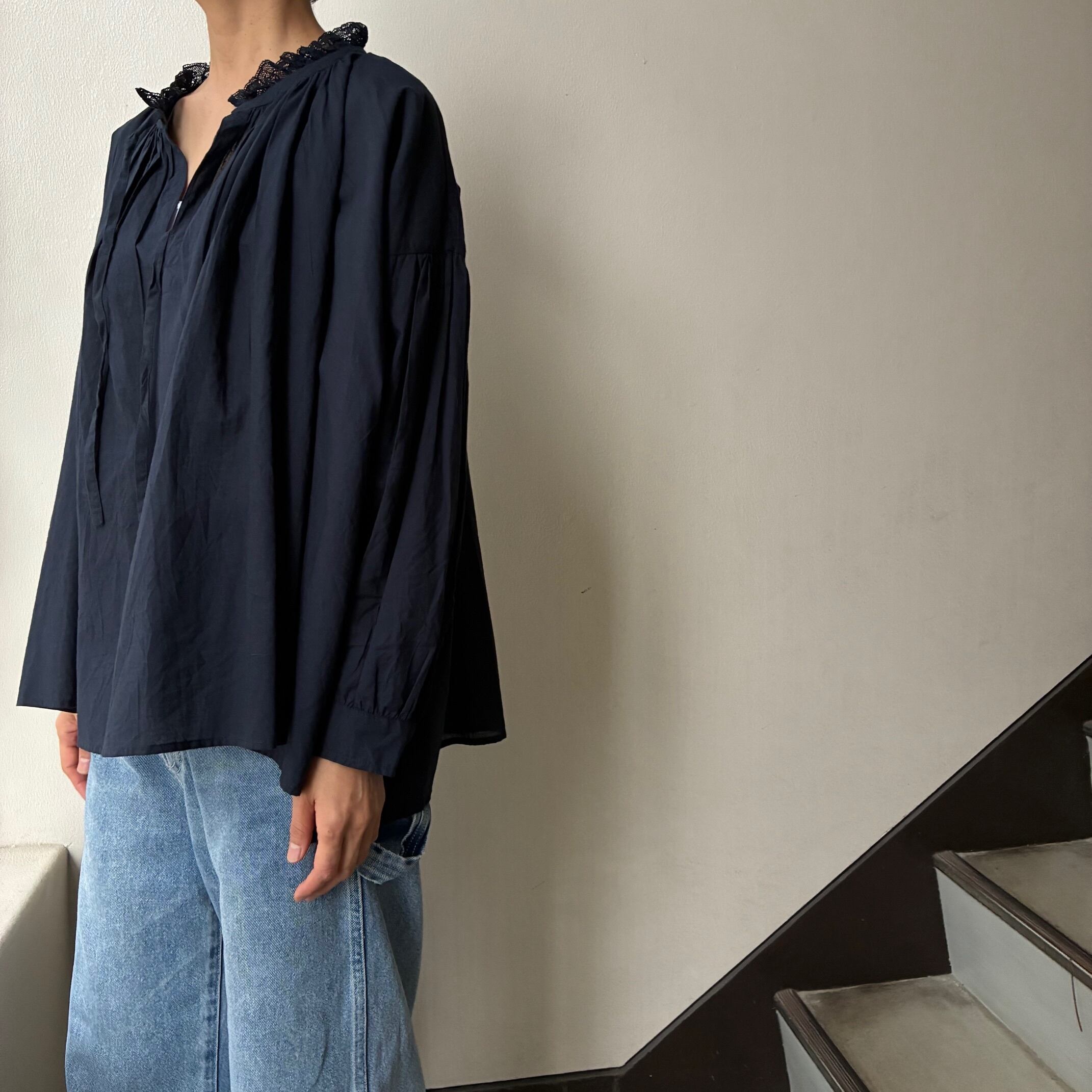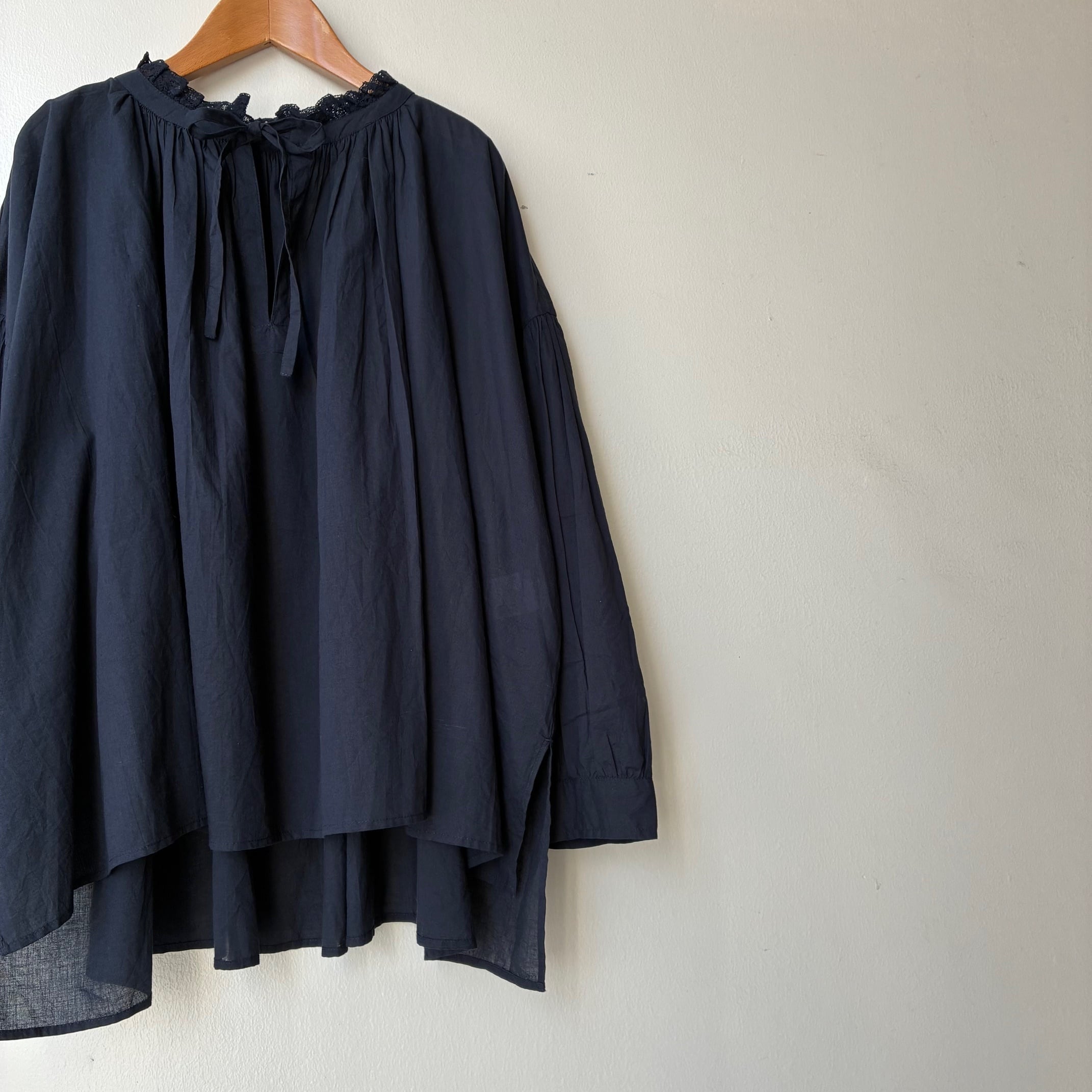 60番手コットンキャンブリックレース ストリングギャザード シャツ (ネイビー)