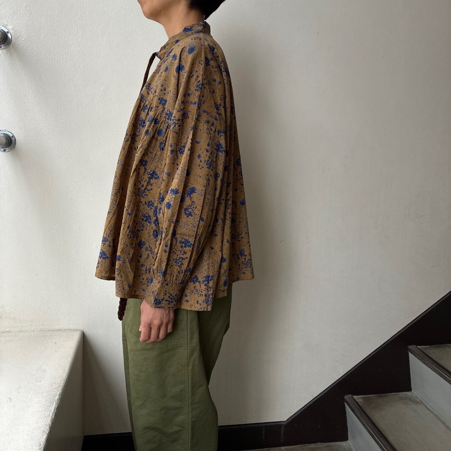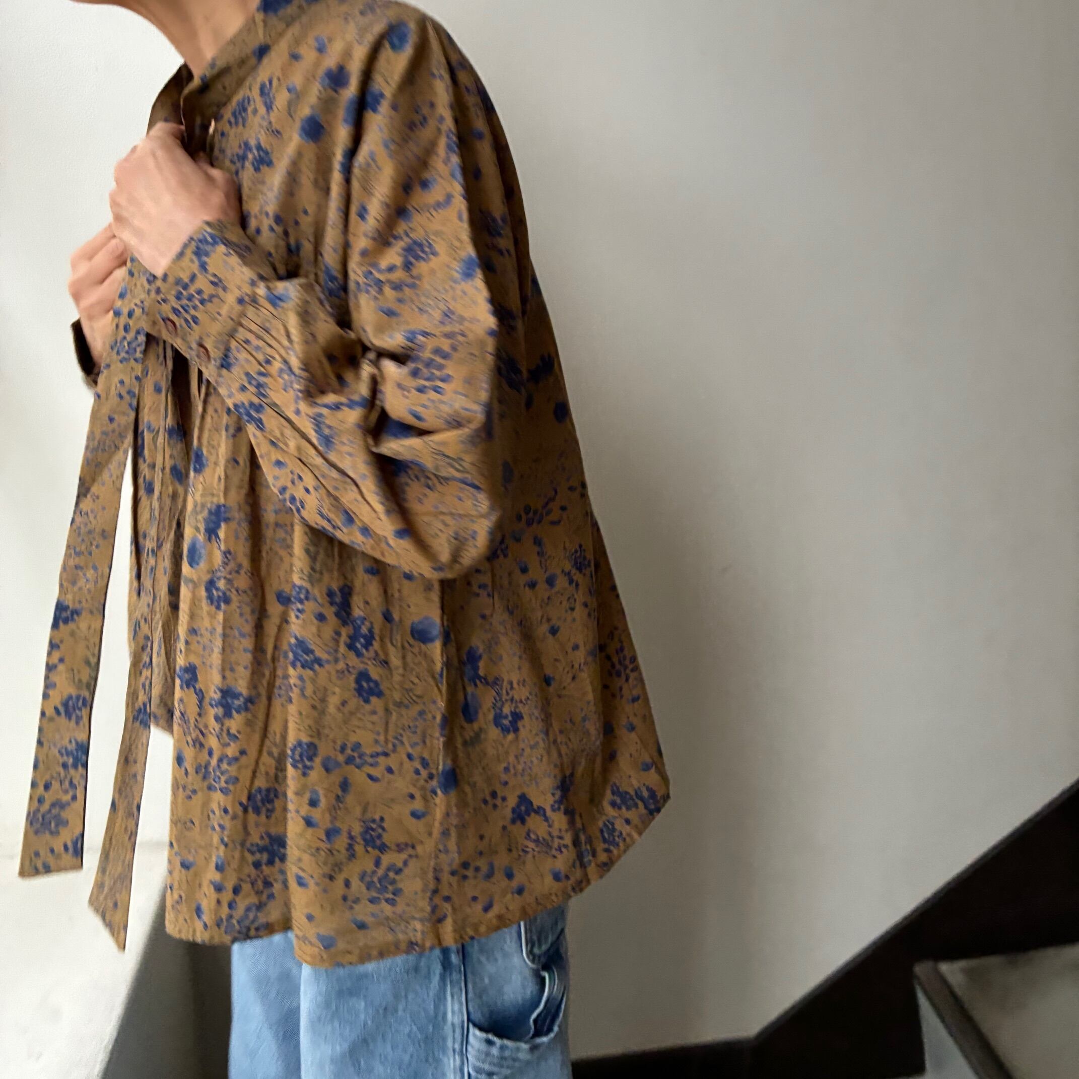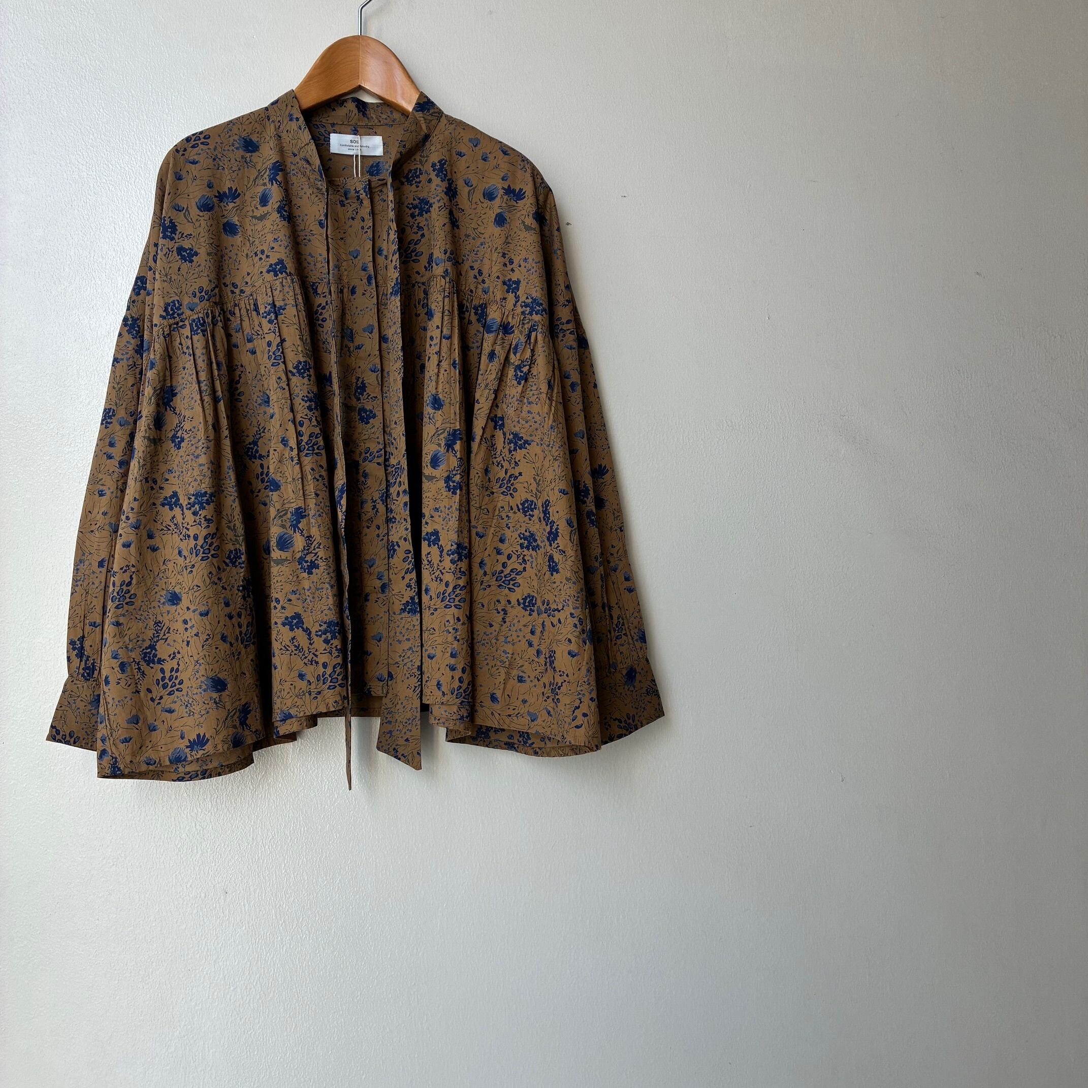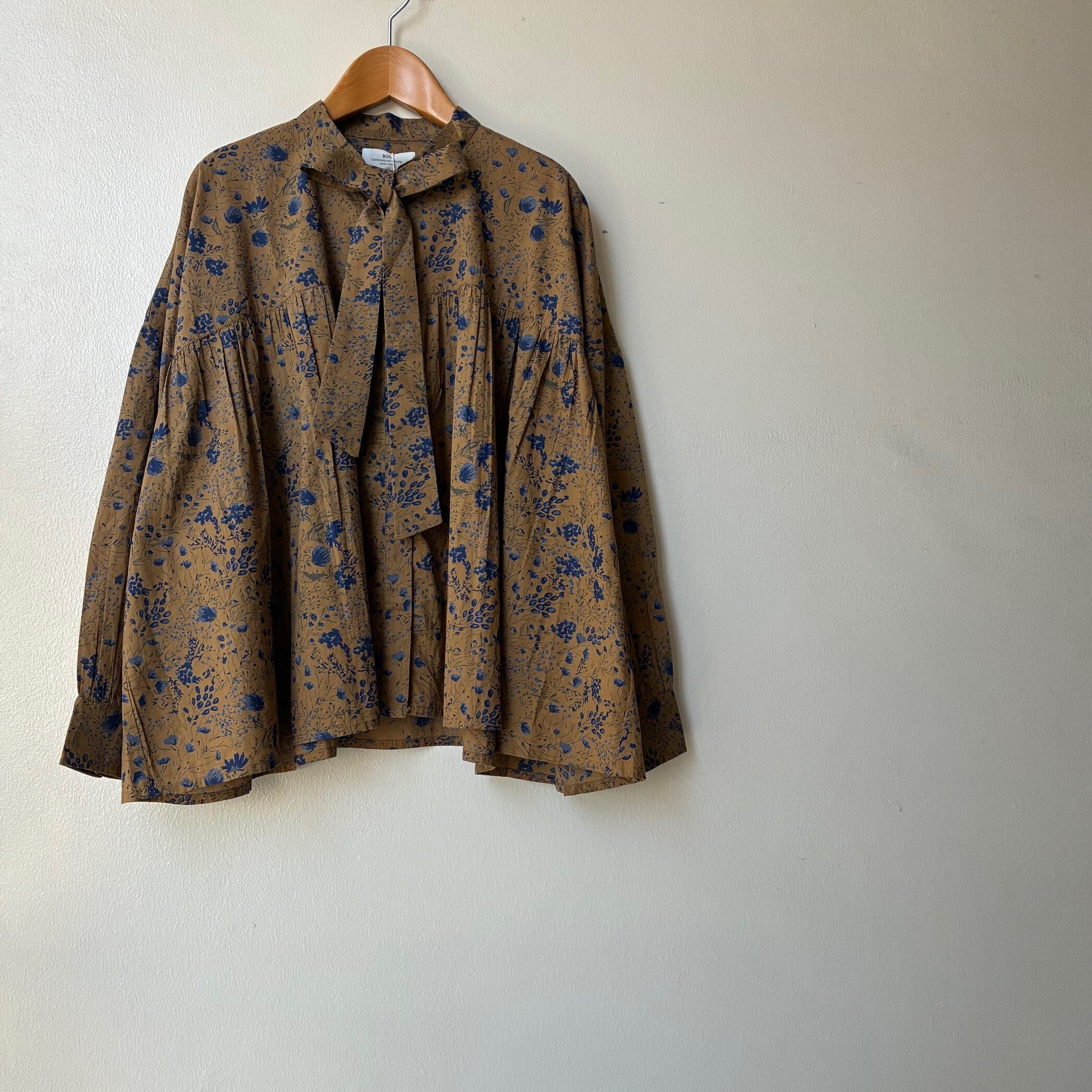 60番手コットンキャンブリック フラワープリントタイ付きフロントギャザーシャツ