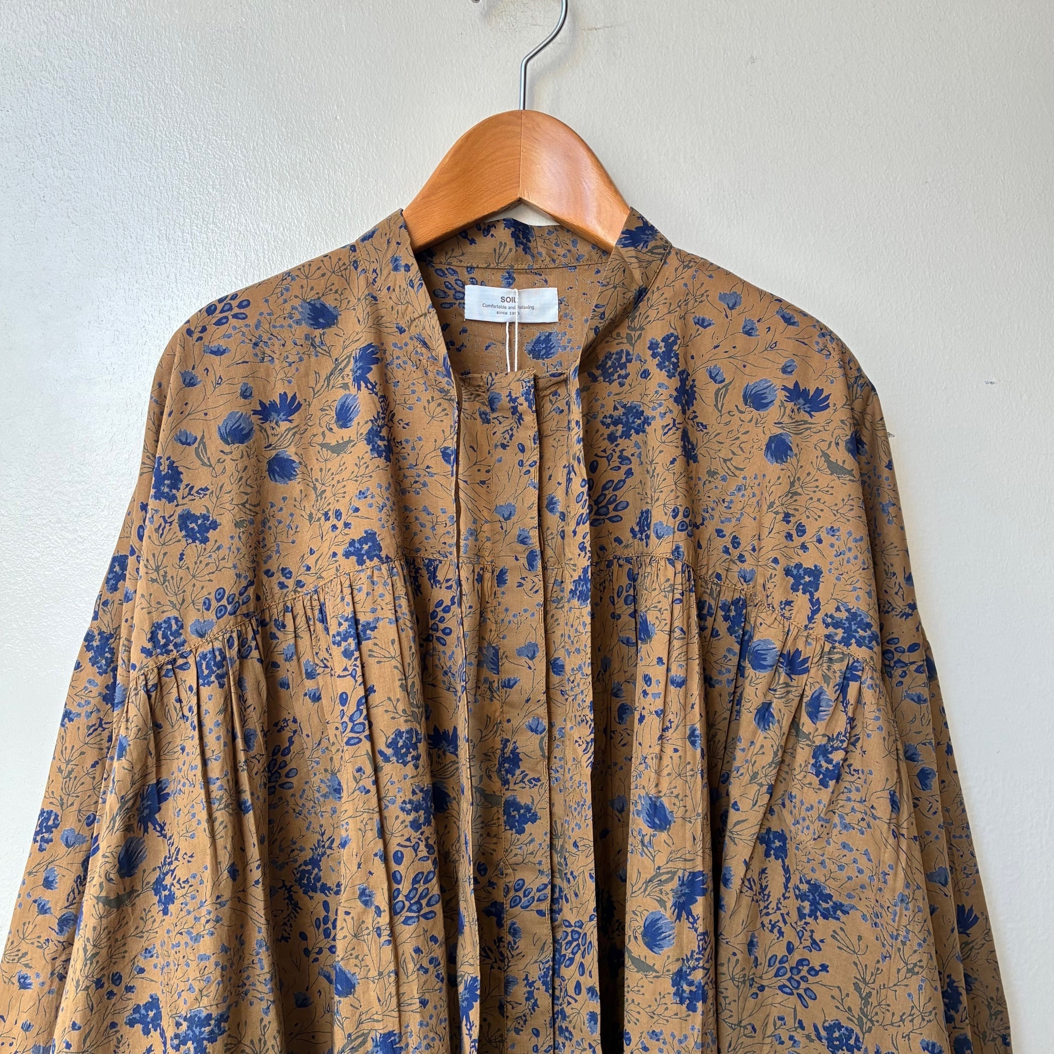 コットン100%のキャンブリック生地は、肌触りの良さとなめらかで繊細な風合いが特徴となっています。SOIL定番のクラシカルなテイストのフラワープリントは、甘さを抑えた大人のかわいらしさを引き立てます。首元のタイデザインと、ふんわりとした前身頃胸辺りのギャザーが女性らしい印象を与えるシャツ。(タイは取り外しはできない仕様です)フロントはボタンを隠した比翼仕立てで、すっきりと上品に仕上げました。結び方次第で表情を変えられるタイがアクセントとなり、シンプルながらも華やかさを感じさせる一枚です。